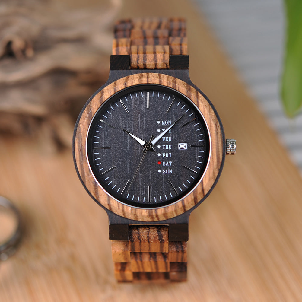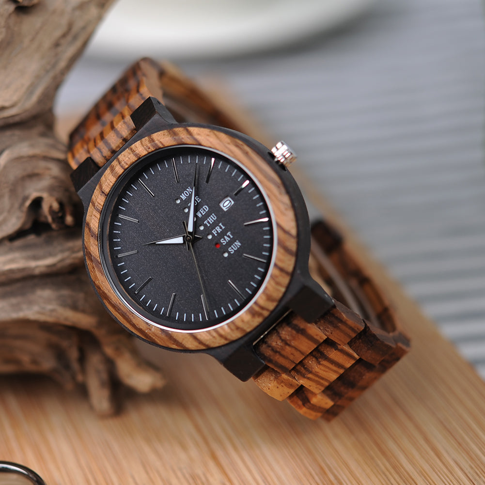 A wood watch is perfect for the discerning individual who values one-of-a-kind pieces. Stay stylish and on schedule with this handcrafted wood watch. Featuring an adjustable wooden band that showcases its beautiful natural wood grain. The watch also includes a handmade bamboo cylinder for a unique touch.