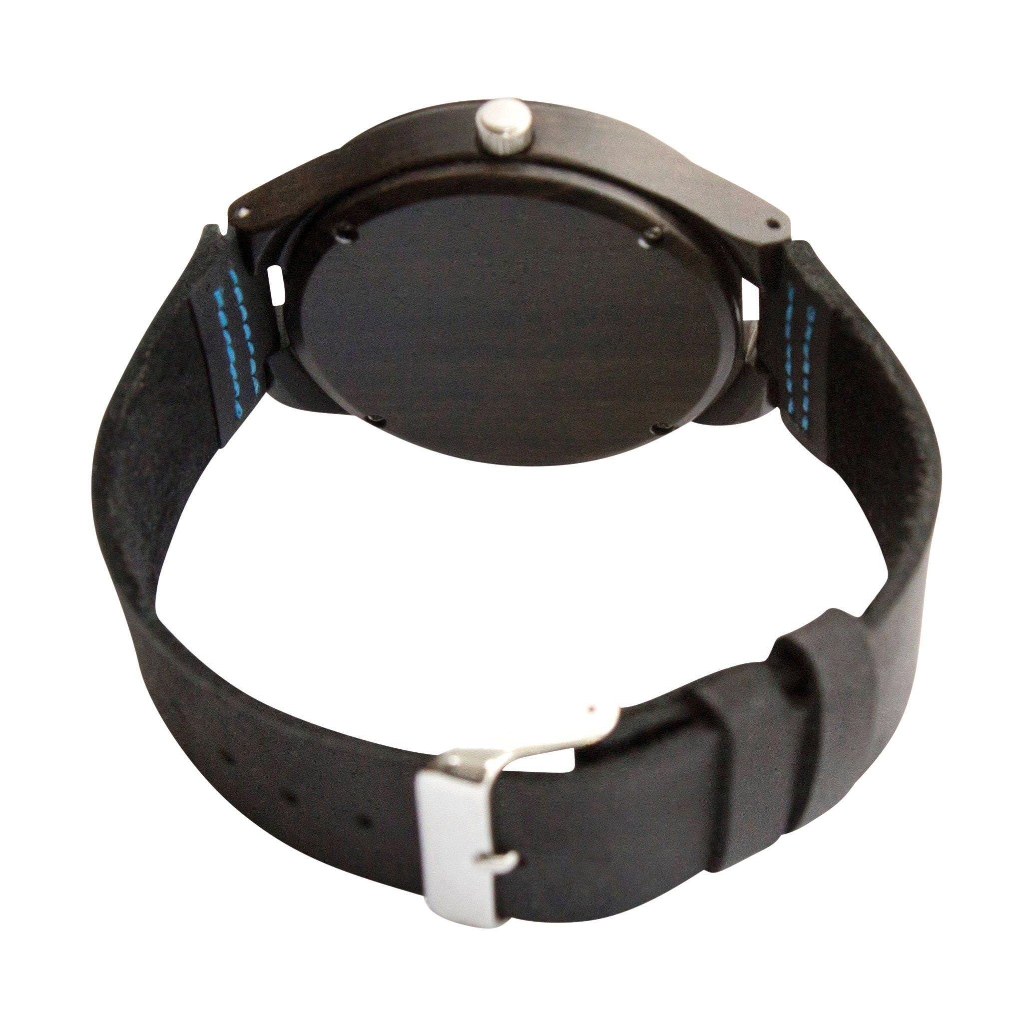 A stylish wooden watch that features a brilliant brown tone case, and paired with a charcoal black leather band. The dial showcases a simple and elegant look, that offers a dark shade, with matching hands; and a vibrant colored second dial, that matched the thread work done on the strap.